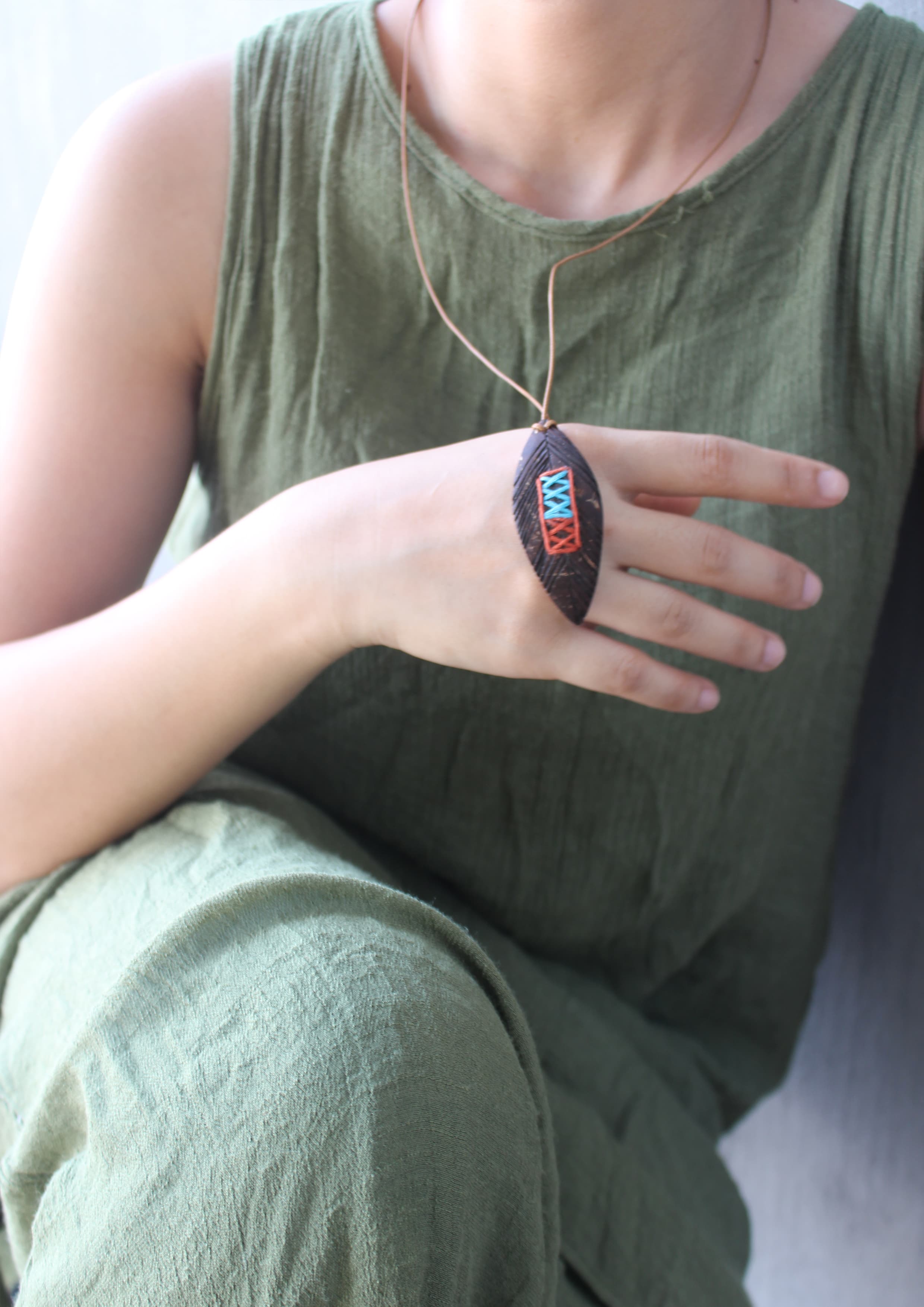 Mẫu dây chuyền này sử dụng 100% gáo dừa kết hợp cùng chỉ thêu, với chiều dài của hình chiếc lá là 6.5 x 2.5 cm, tổng chiều dài của cả dây chuyền là 60cm, phù hợp với những ai yêu thích phong cách nhẹ nhàng, đơn giản nhưng cũng thật cá tính.