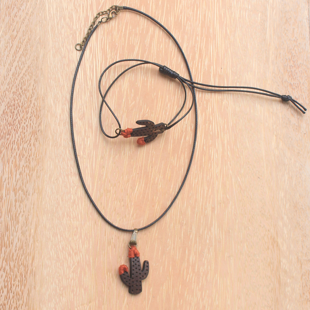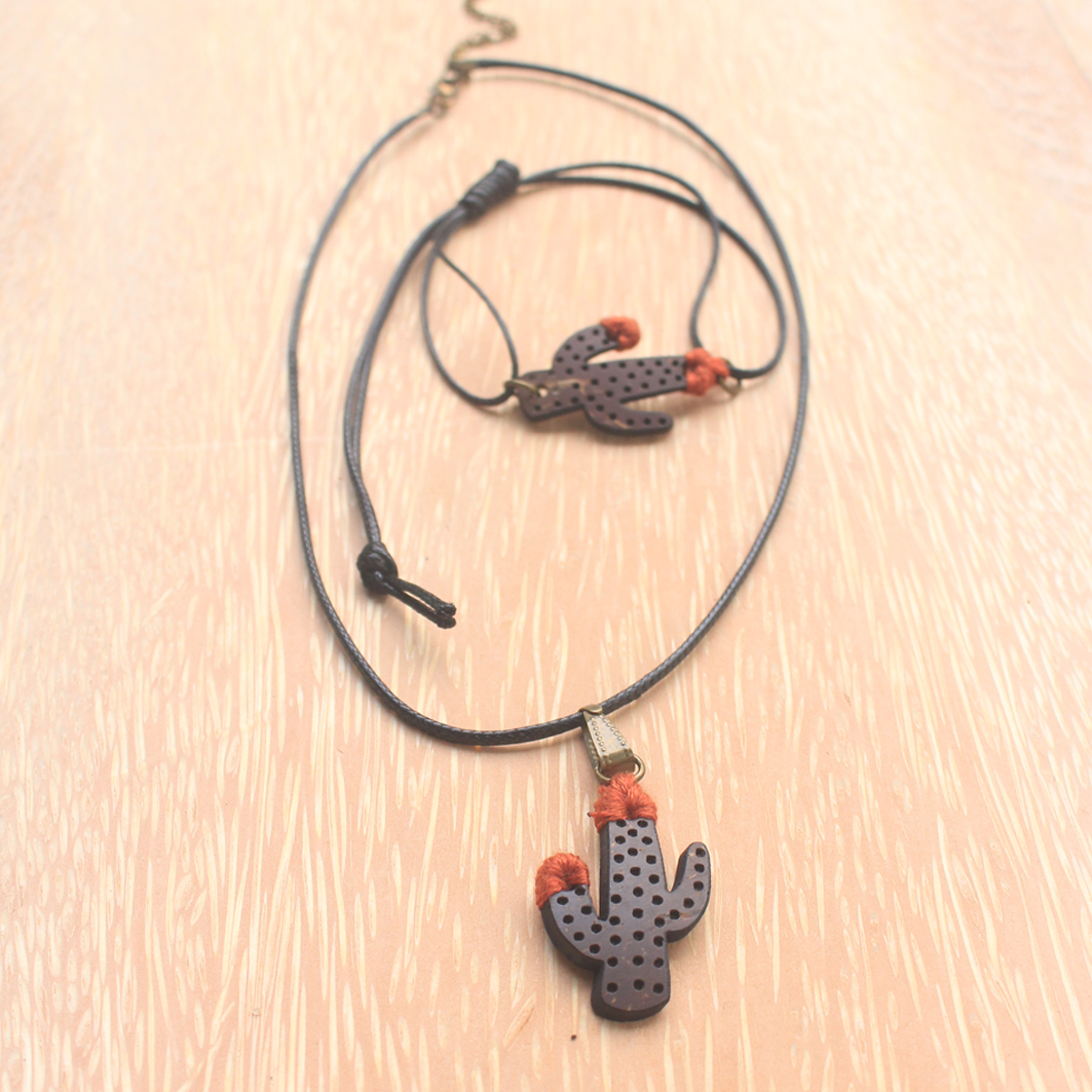 - Bộ trang sức 3 món Xương Rồng Đỏ của Cocohand được làm từ chất liệu chính là gáo dừa đen bóng, chỉ thêu đỏ, dây bông sáp và phụ kiện làm trang sức từ kim loại khác. Dây chuyền có chiều dài 35cm, kiểu đeo cao ôm gần sát cổ giúp tôn sức quyến rũ và cá tính cho chủ nhân. Vòng tay có chiều dài 22cm, có gút dễ dàng tự điều chỉnh. Kẹp tóc được làm từ gáo dừa đen bóng và chỉ thêu đỏ, mang lại vẻ đẹp duyên dáng cho người dùng.