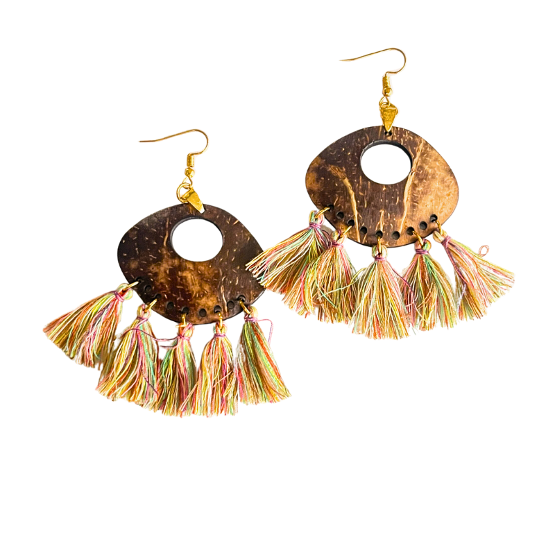 Nguyên liệu chính của bông tai dừa phối tua rua phong cách Bohemian, gam cầu vồng bao gồm gáo dừa đen tự nhiên, tua rua nhiều màu sắc và móc hoa tai hợp kim cao cấp. Quy trình chế tác sản phẩm hoàn toàn thủ công bởi các nghệ nhân tài năng tại Cocohand.