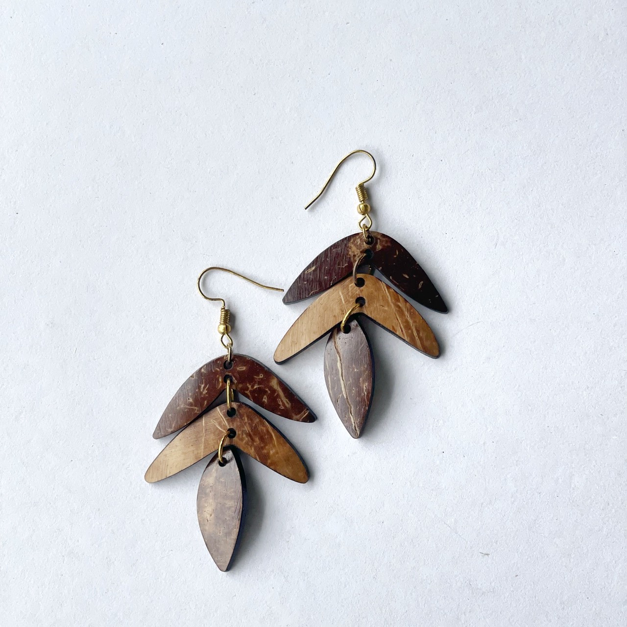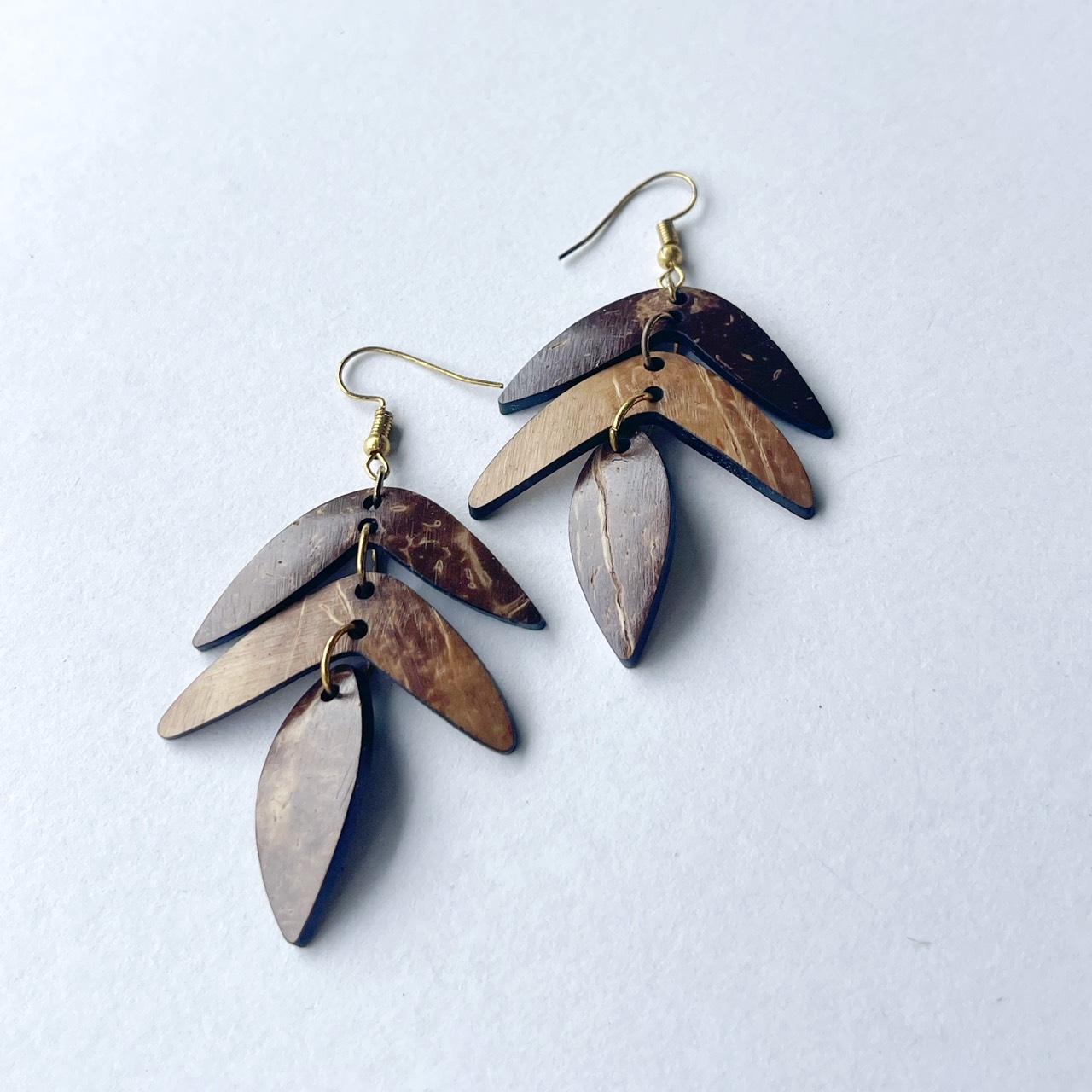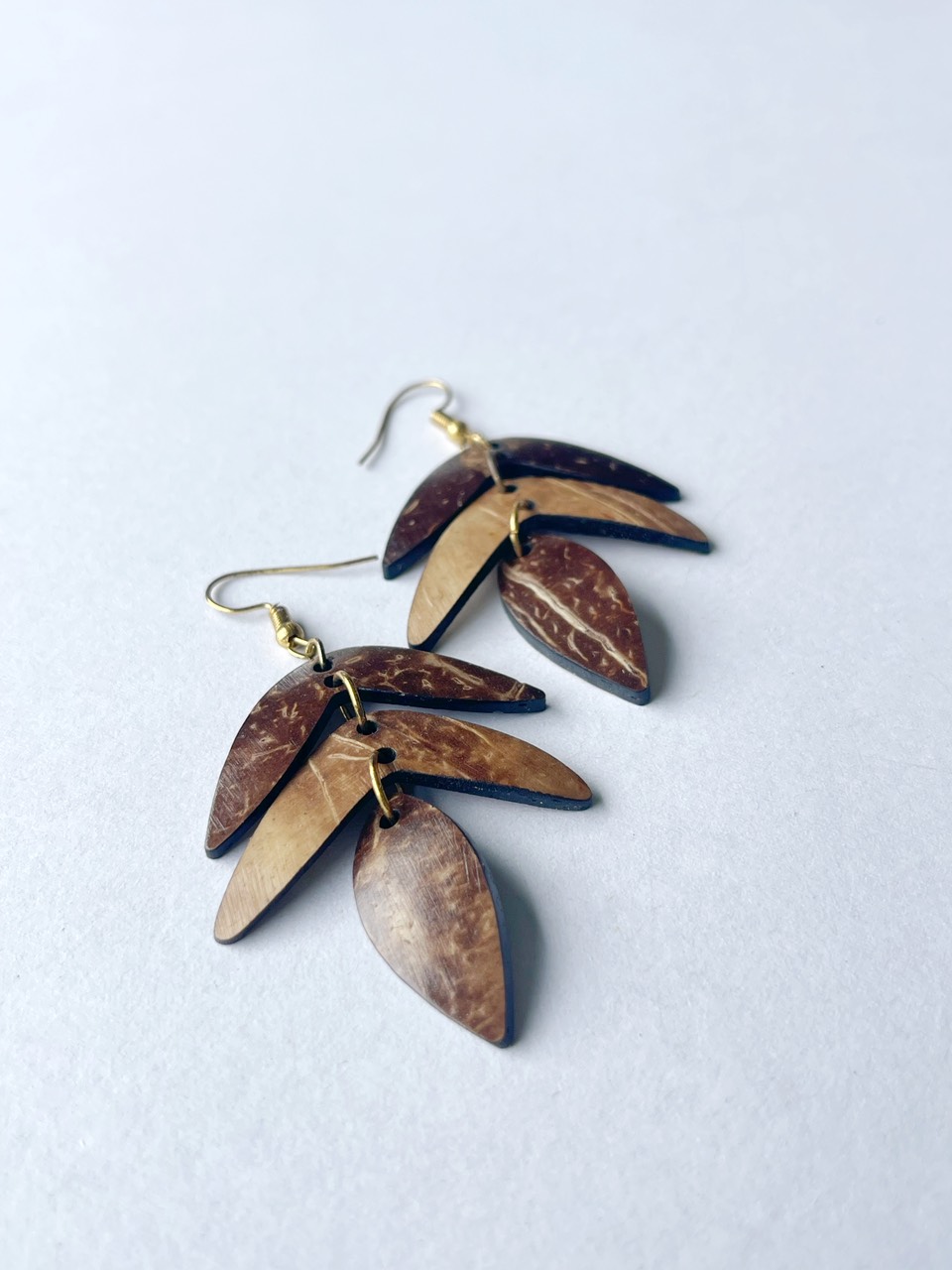 - Nguyên liệu chính để tạo ra Bông tai Dừa dáng lá xếp tầng là gáo dừa da me tự nhiên kết hợp với các phụ kiện trang sức khác.