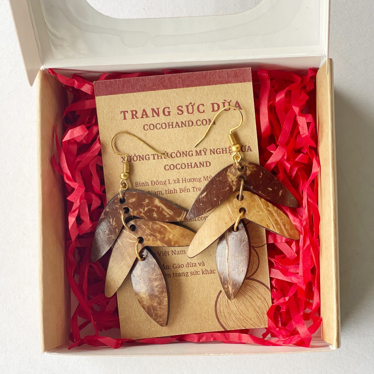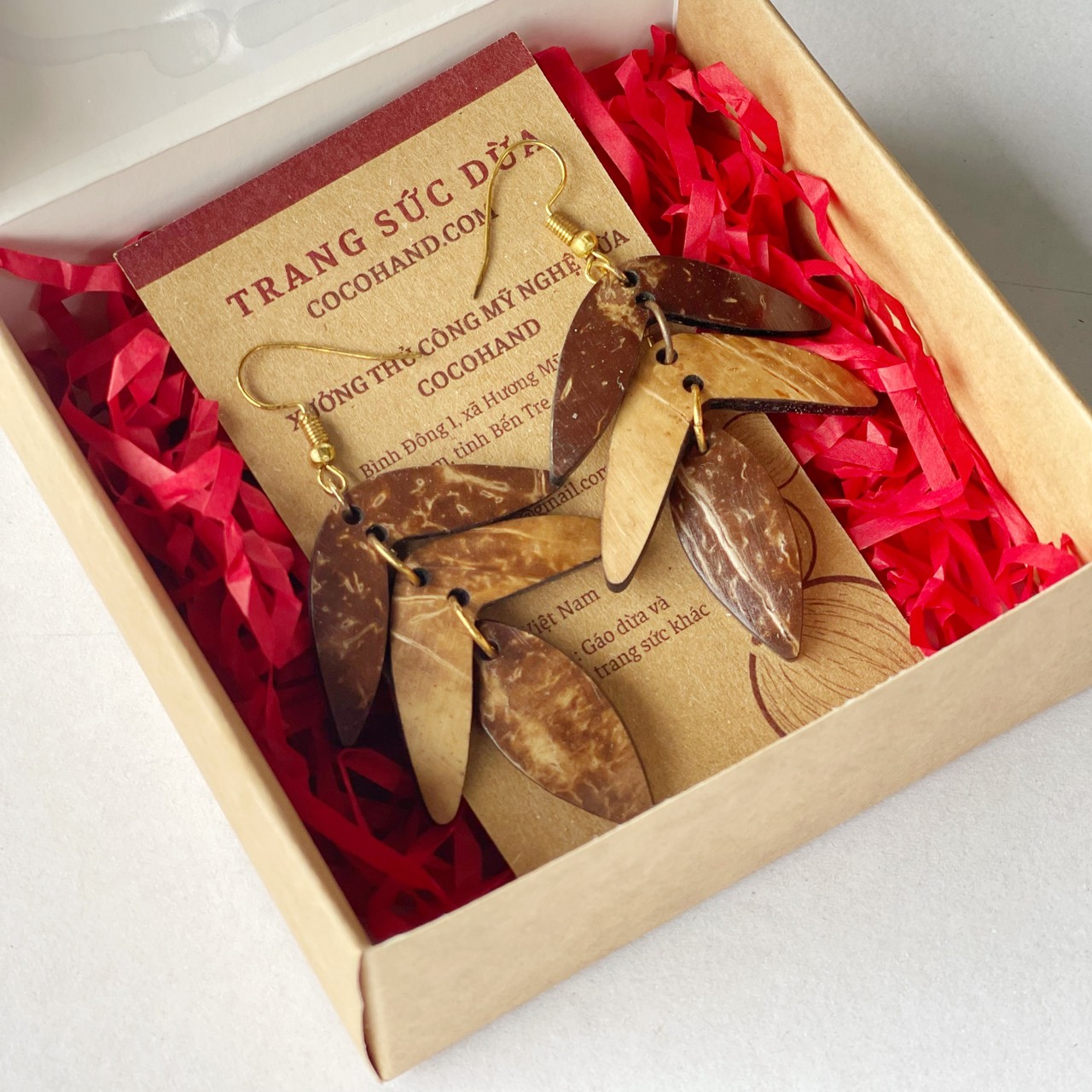 - Nguyên liệu chính từ gáo dừa da me được chọn lọc kỹ càng. Quy trình sản xuất Bông tai dừa dáng lá xếp tầng được thực hiện bởi những người thợ lành nghề, đảm bảo từng chi tiết được hoàn thiện một cách tỉ mỉ.