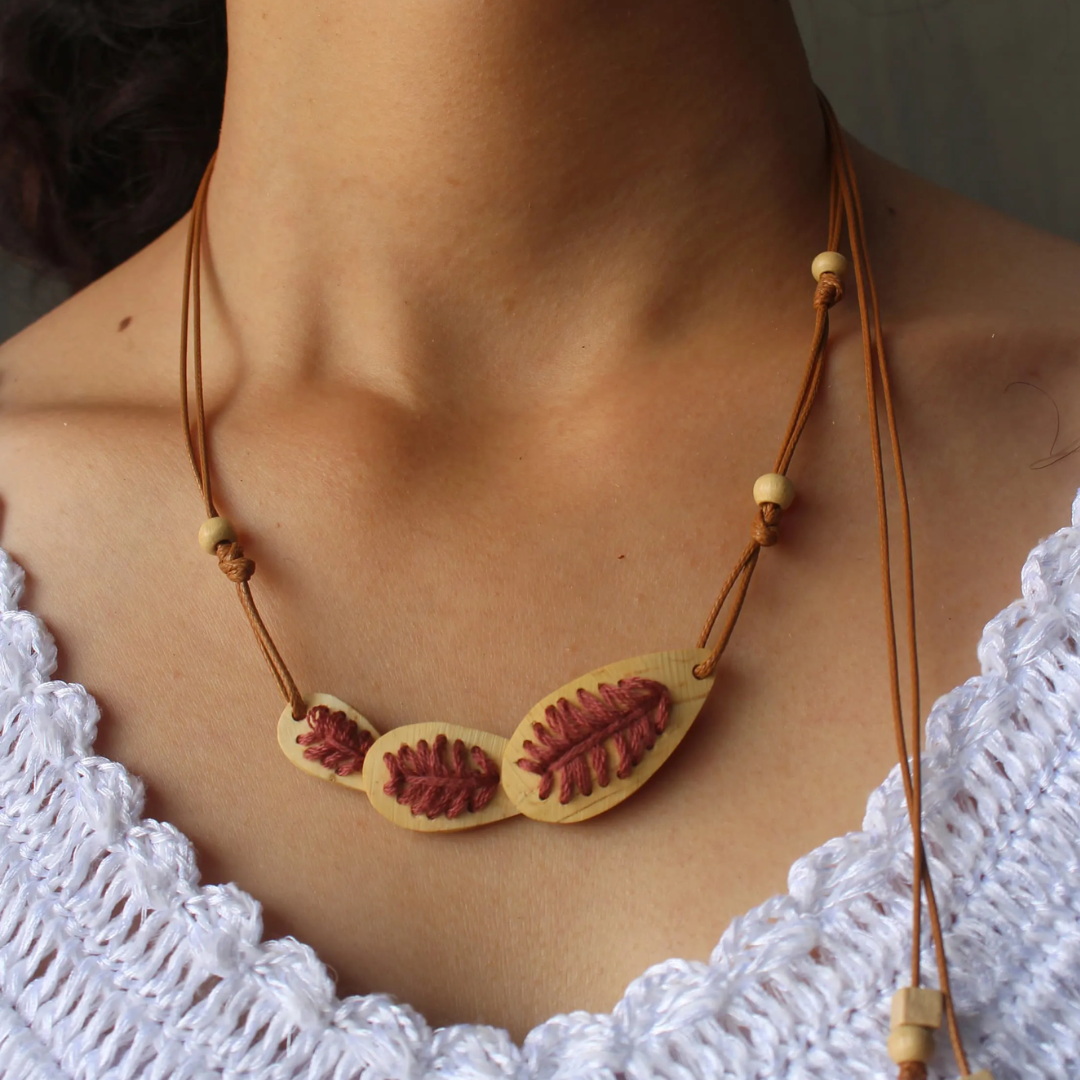 - Dây Chuyền Ba Lá Phối Chỉ Thêu được làm từ chất liệu gáo dừa tự nhiên, dây và chỉ thêu tinh tế cùng những hạt gỗ nhỏ. Kích thước tổng chiều dài của dây chuyền là 60cm, với kích thước mặt gáo (3 lá) là 7.5cm x 2cm.