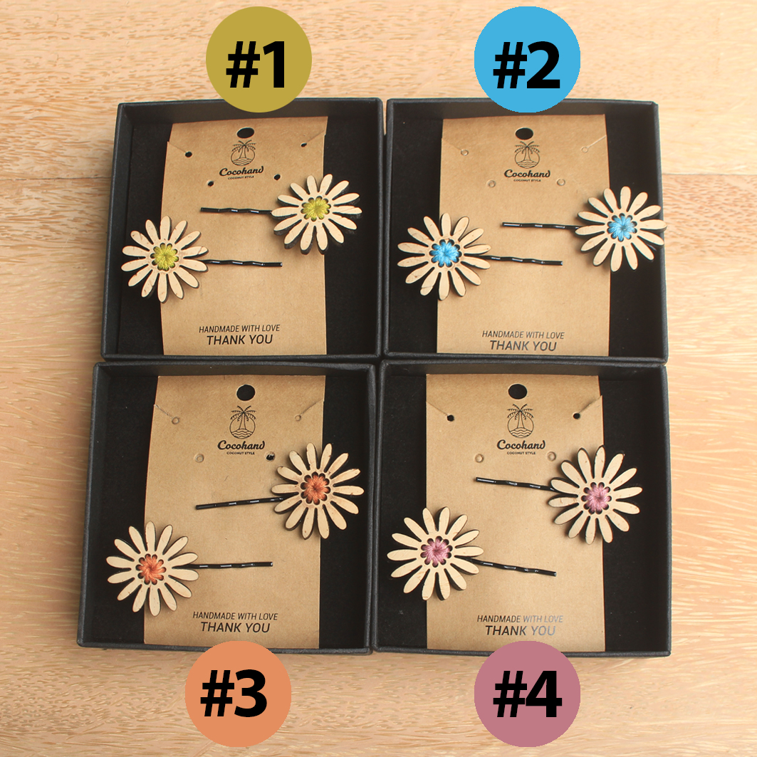- Kẹp tóc Hoa Cúc là một sản phẩm kẹp tóc nhỏ xinh được làm từ chất liệu gáo dừa trắng thiên nhiên phối cùng chỉ thêu nhiều màu, mang đến nét đẹp ngây thơ, xinh xẻo đốn tim đối phương. Với giá chỉ 40,000vnđ cho 1 cặp (2 kẹp), sản phẩm này sẽ là lựa chọn hoàn hảo cho các nàng.