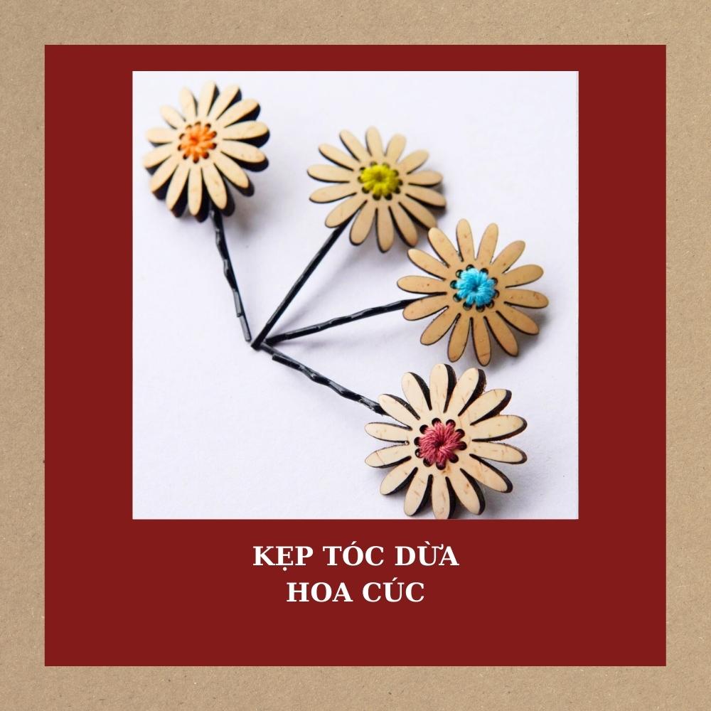 - Kẹp tóc Hoa Cúc được làm từ gáo dừa trắng kết hợp với chỉ thêu nhiều màu và các phụ kiện khác. Vì nguyên liệu chính là gáo dừa từ thiên nhiên nên sản phẩm rất gần gũi với môi trường và đảm bảo an toàn sức khỏe cho khách hàng.