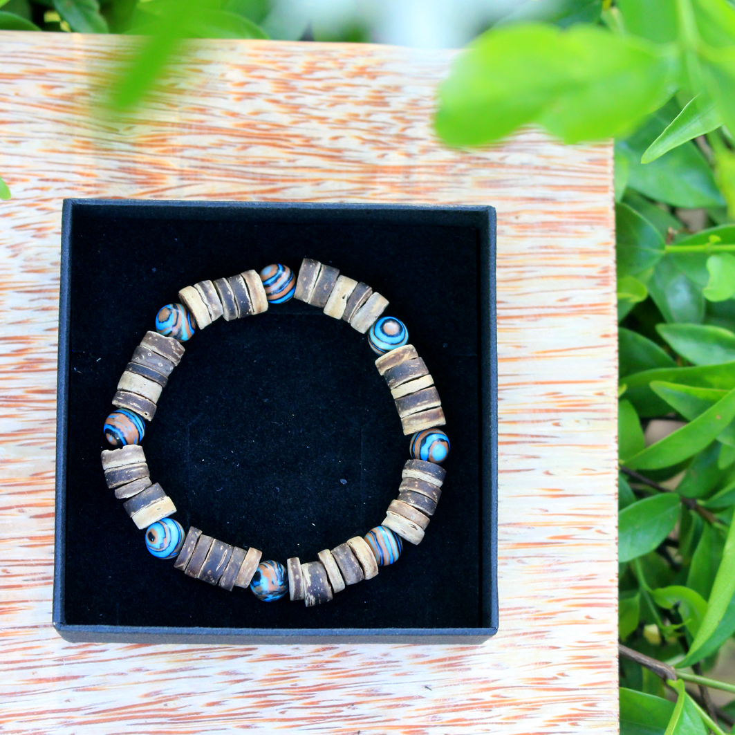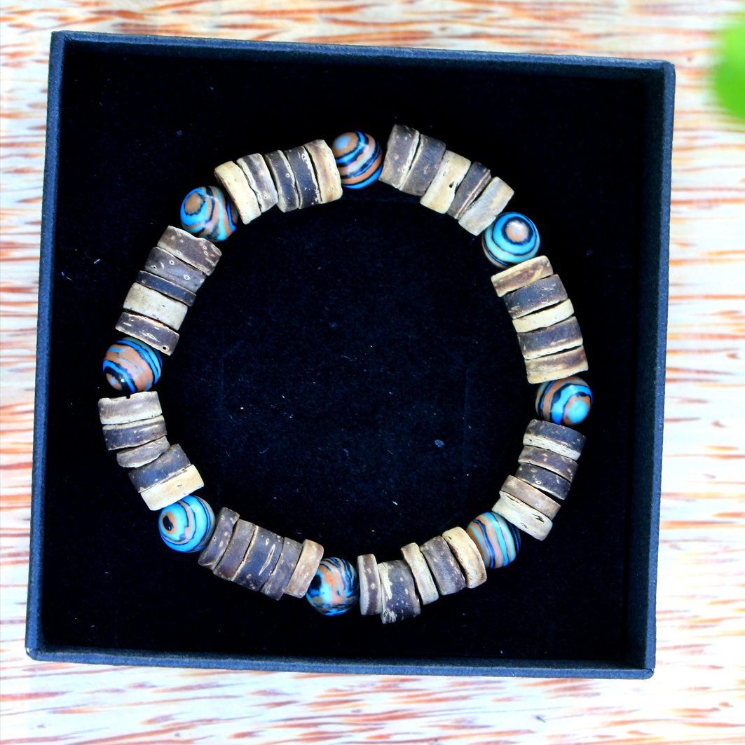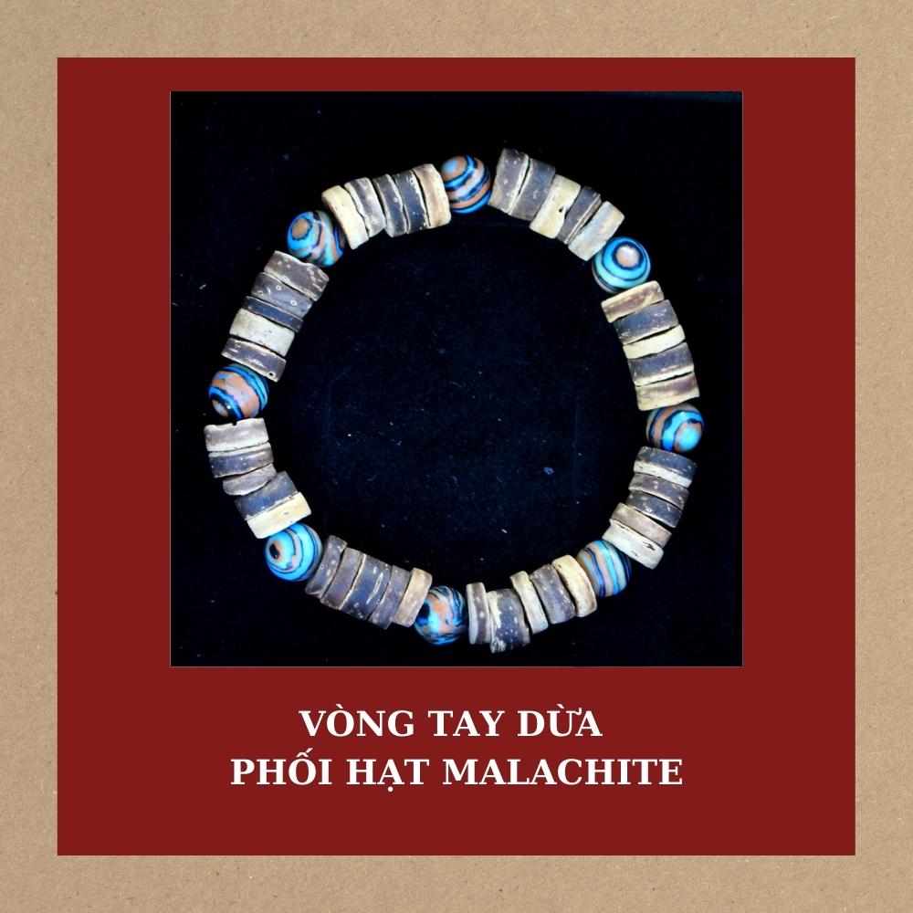 - Vòng tay chuỗi dừa phối hạt Malachite được làm từ gáo dừa, kết hợp với một số phụ kiện khác. Vì nguyên liệu chính là gáo dừa từ thiên nhiên nên sản phẩm rất gần gũi với môi trường và đảm bảo an toàn sức khỏe cho khách hàng.