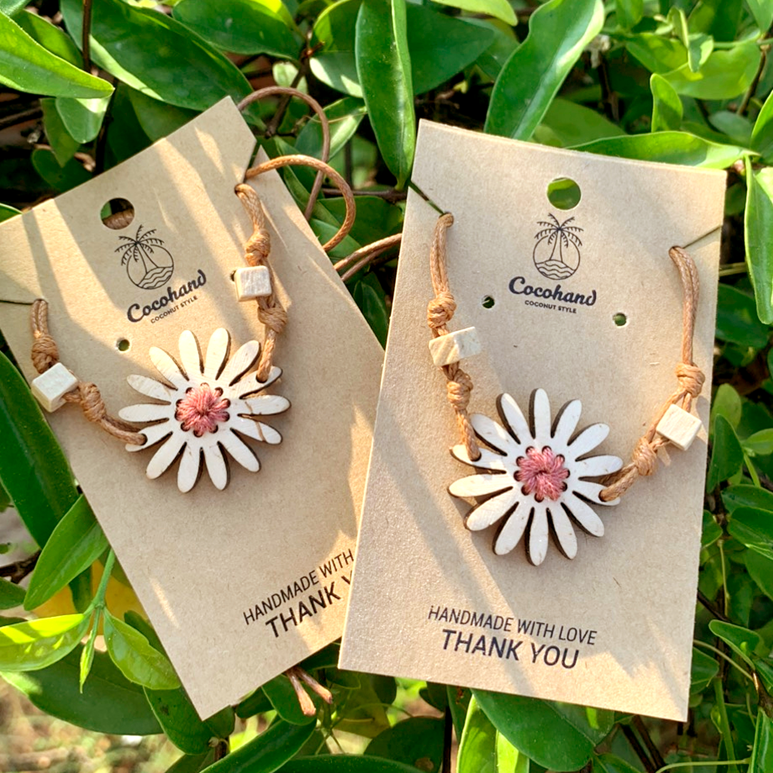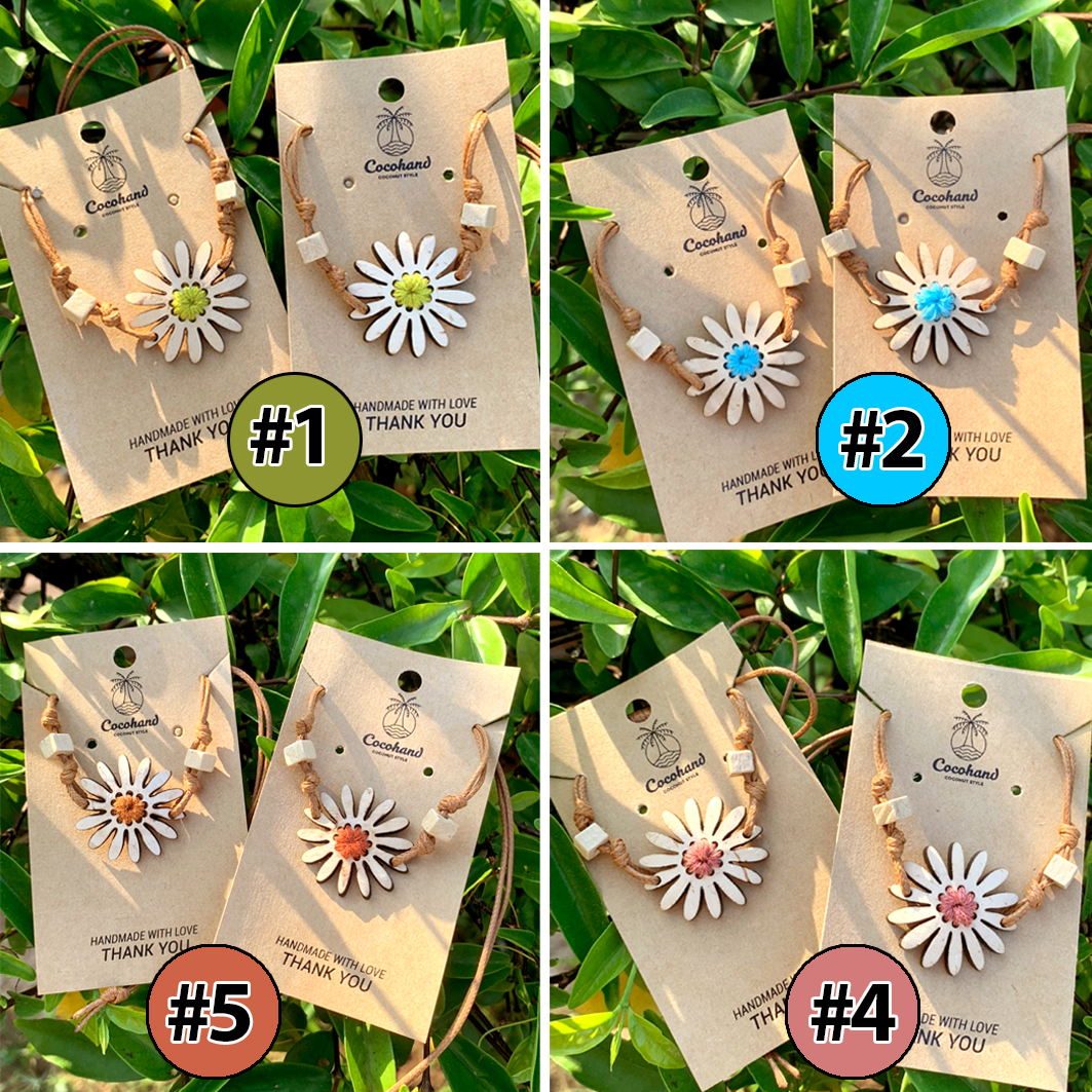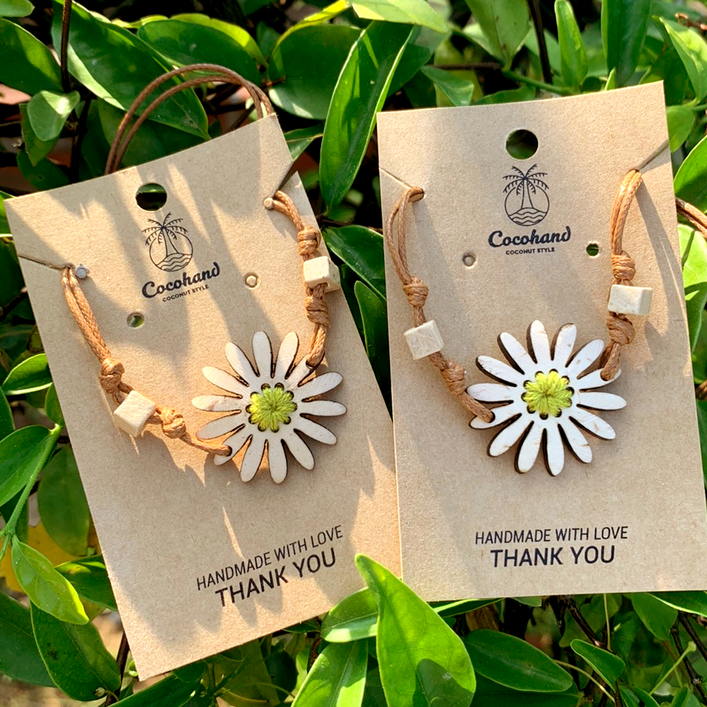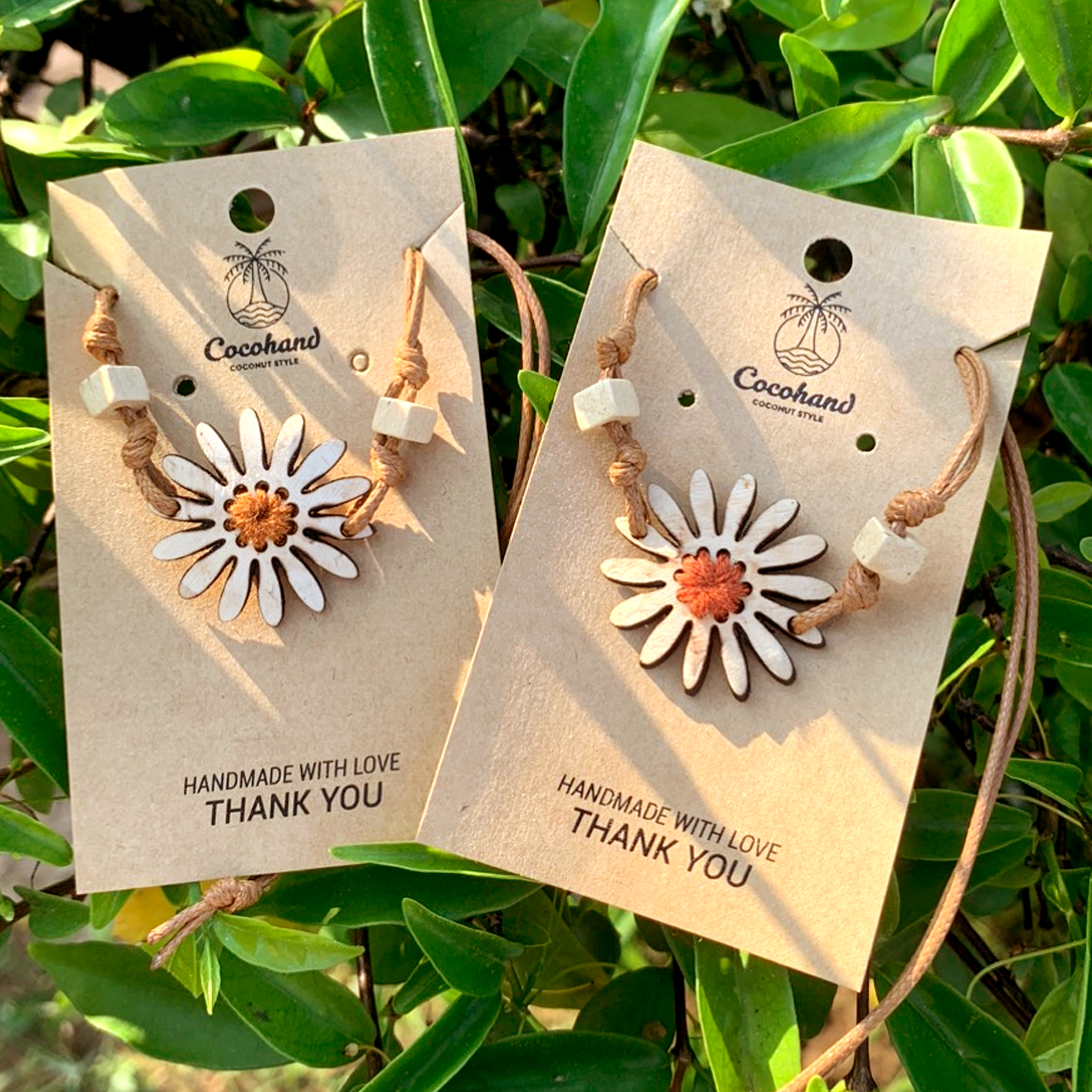 - Vòng tay dừa hoa cúc phối chỉ thêu được làm từ gáo dừa trắng, kết hợp với một số phụ kiện như dây sáp. Vì nguyên liệu chính là gáo dừa từ thiên nhiên nên sản phẩm rất gần gũi với môi trường và đảm bảo an toàn sức khỏe cho khách hàng.