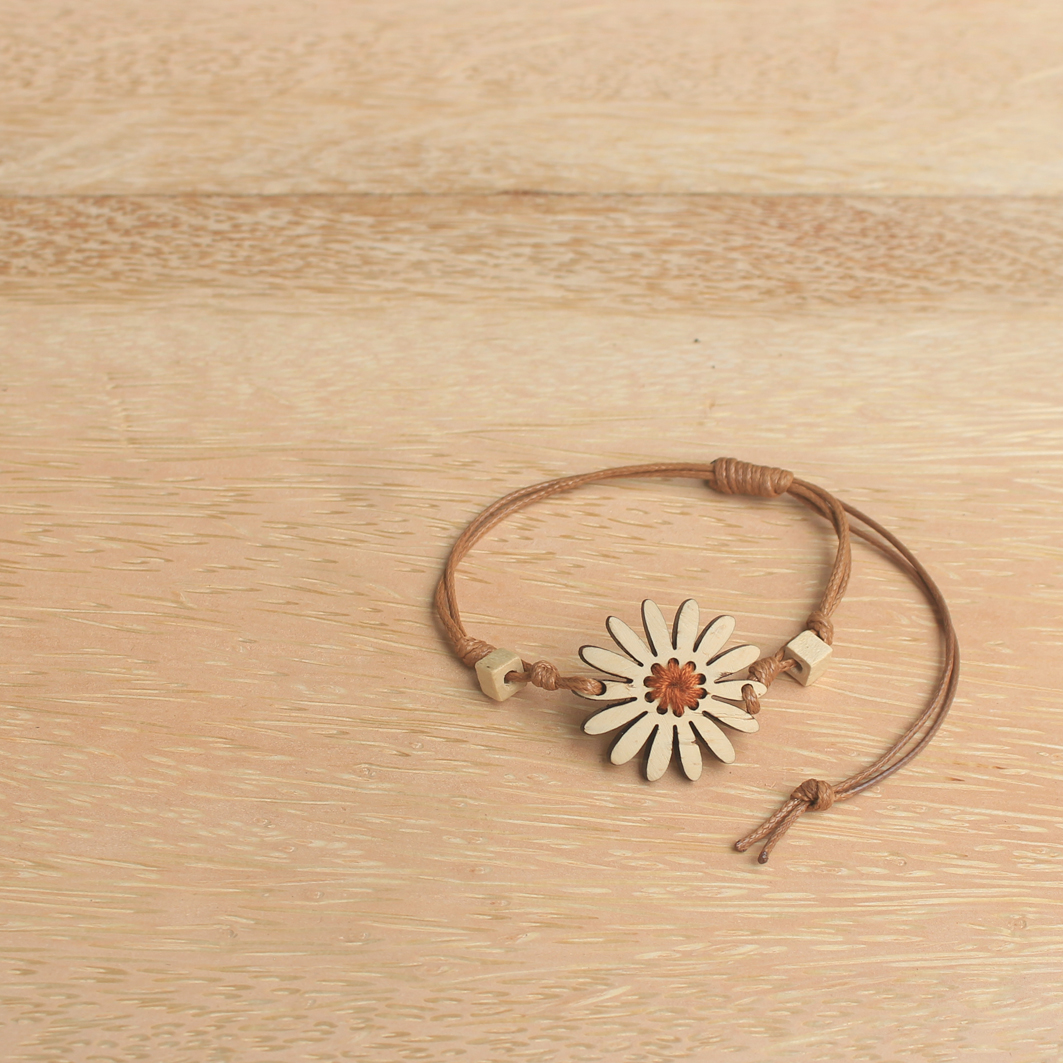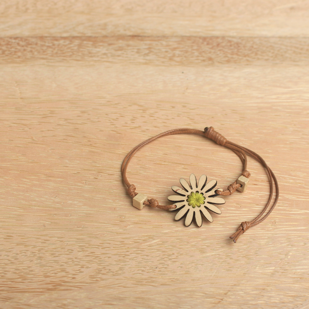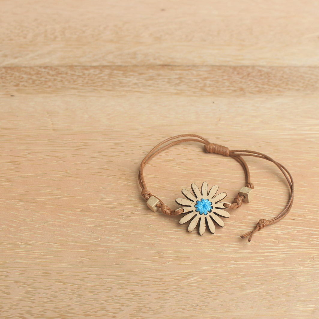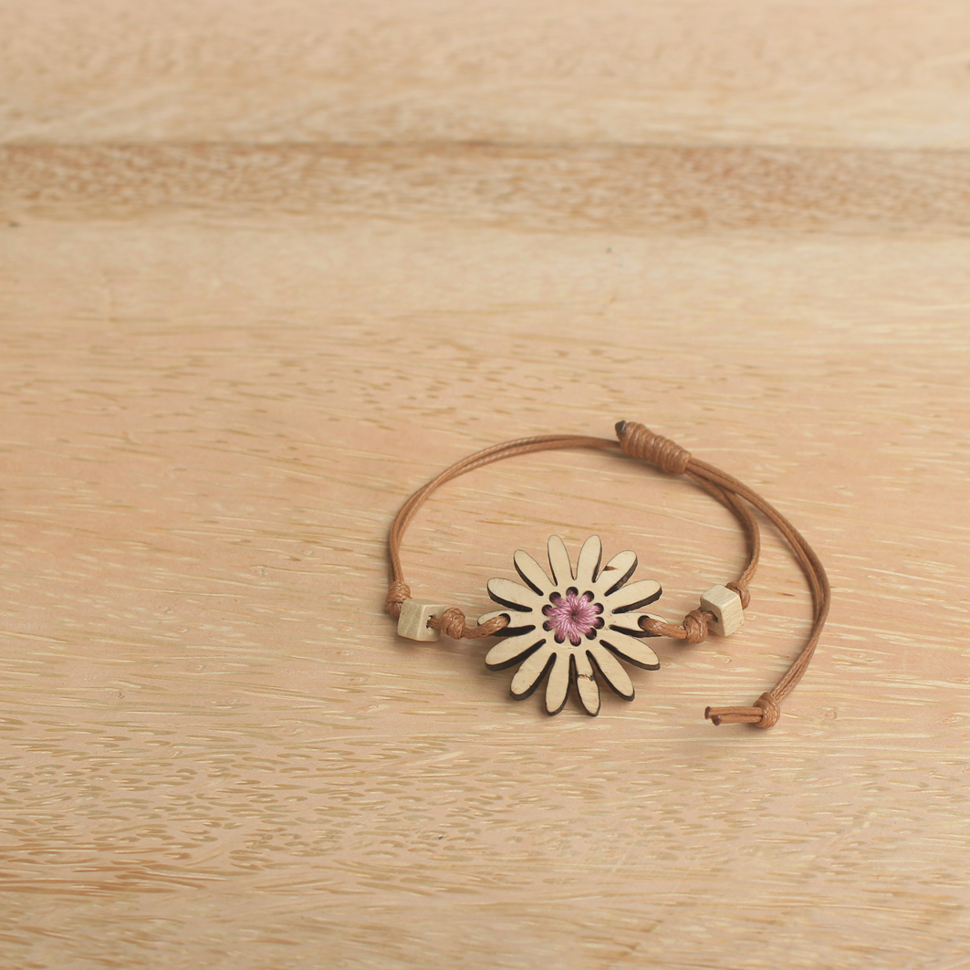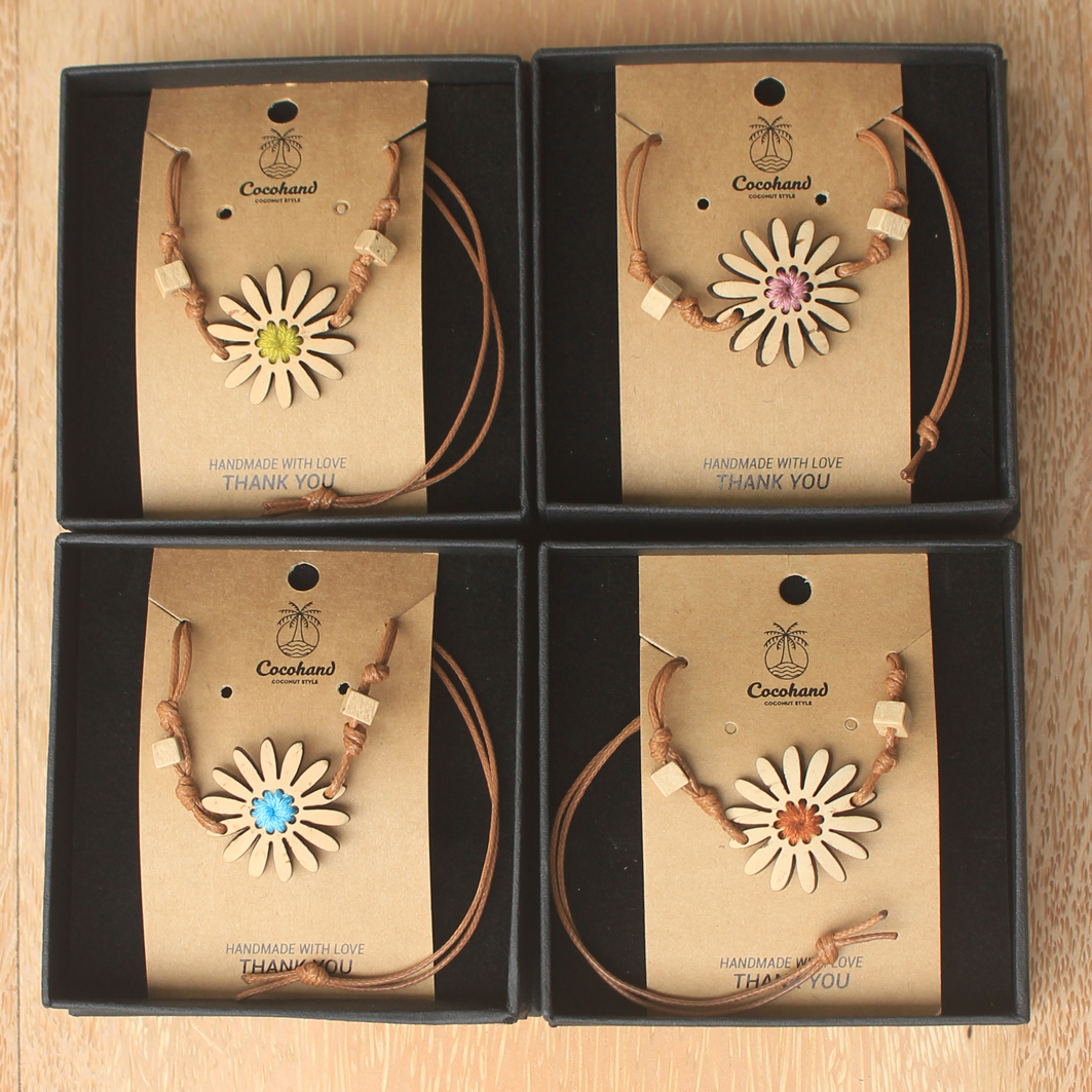 - Vòng tay dừa hoa cúc phối chỉ thêu được làm từ gáo dừa trắng, kết hợp với một số phụ kiện như dây sáp. Vì nguyên liệu chính là gáo dừa từ thiên nhiên nên sản phẩm rất gần gũi với môi trường và đảm bảo an toàn sức khỏe cho khách hàng.
