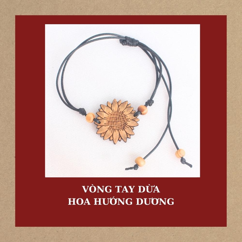- Vòng tay hoa Hướng Dương được làm từ gáo dừa trắng, kết hợp với một số phụ kiện như dây đỏ. Vì nguyên liệu chính là gáo dừa từ thiên nhiên nên sản phẩm rất gần gũi với môi trường và đảm bảo an toàn sức khỏe cho khách hàng.
