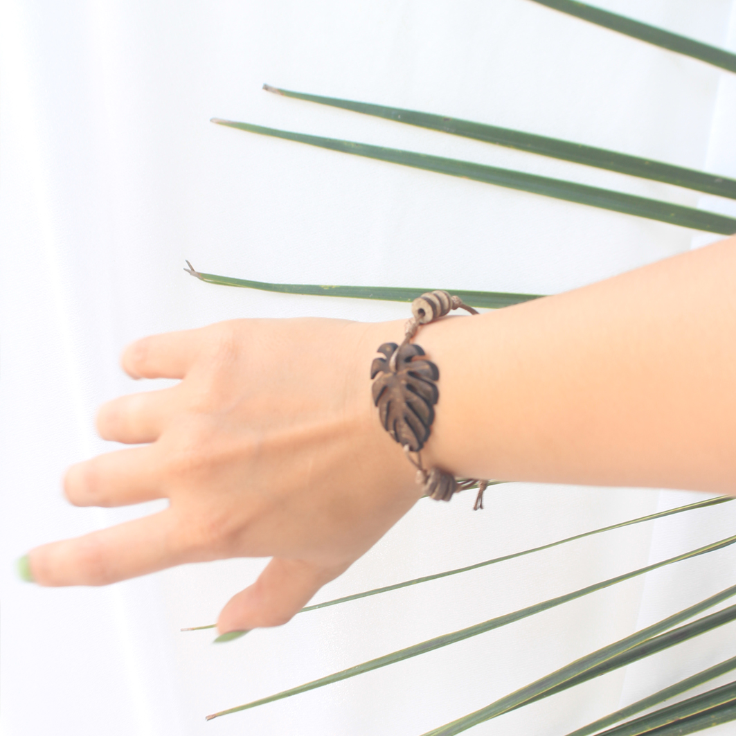 - Chất liệu chính của vòng tay là gáo dừa đen tự nhiên, mang lại sự gần gũi và tự nhiên cho người sử dụng. Dây và khoen dừa mini được sử dụng để tạo thành một chiếc vòng tay hoàn hảo.