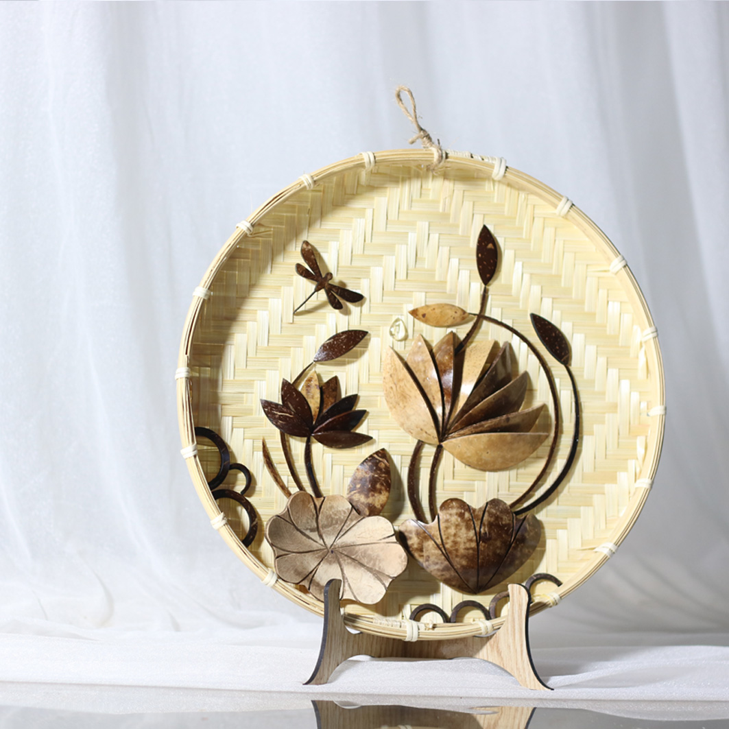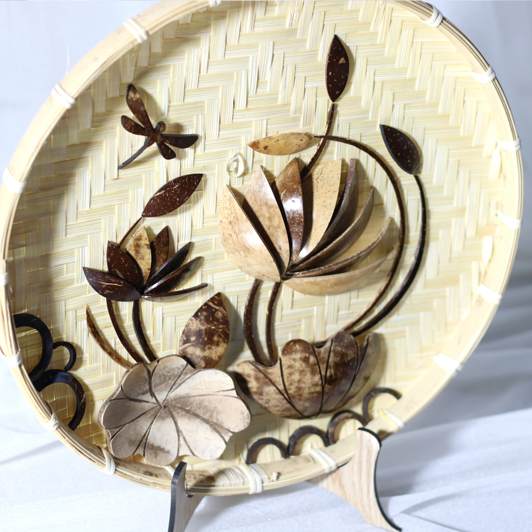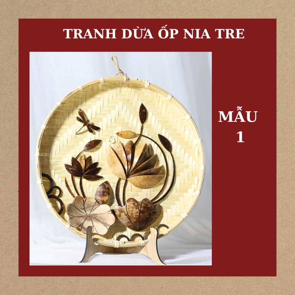 Sự độc đáo còn nằm ở khâu thiết kế hình hoa sen tinh xảo bằng gáo dừa kết hợp với chiếc nia tre mang đậm màu sắc dân tộc Việt Nam. Tranh gáo dừa ốp nia tre kết hợp hài hòa tạo nên một bức tranh giản dị, thẩm mỹ, nhẹ nhàng và tinh tế. Tranh có độ bền từ 3 -5 năm, đã xử lý ẩm mốc, tranh chất lượng và rất gẫn gũi môi trường.