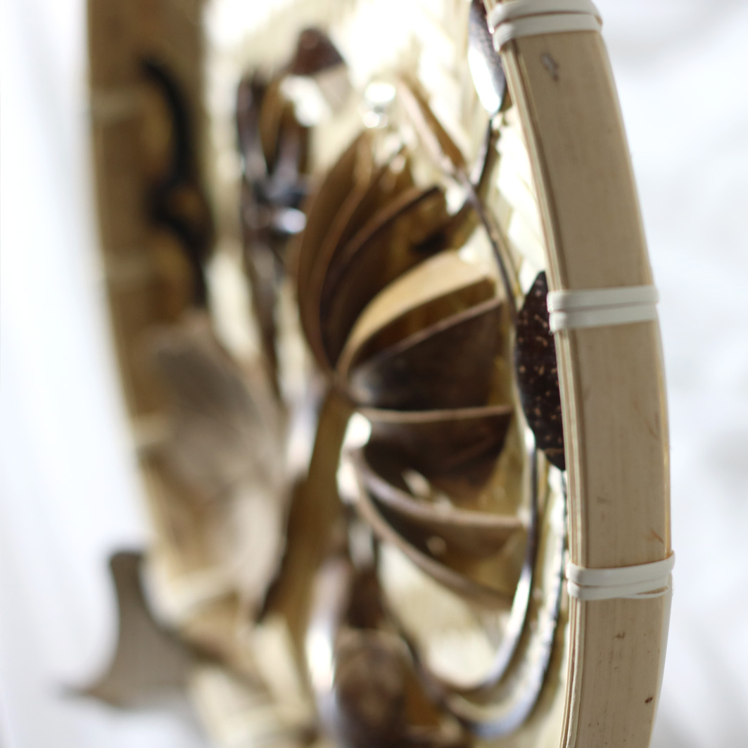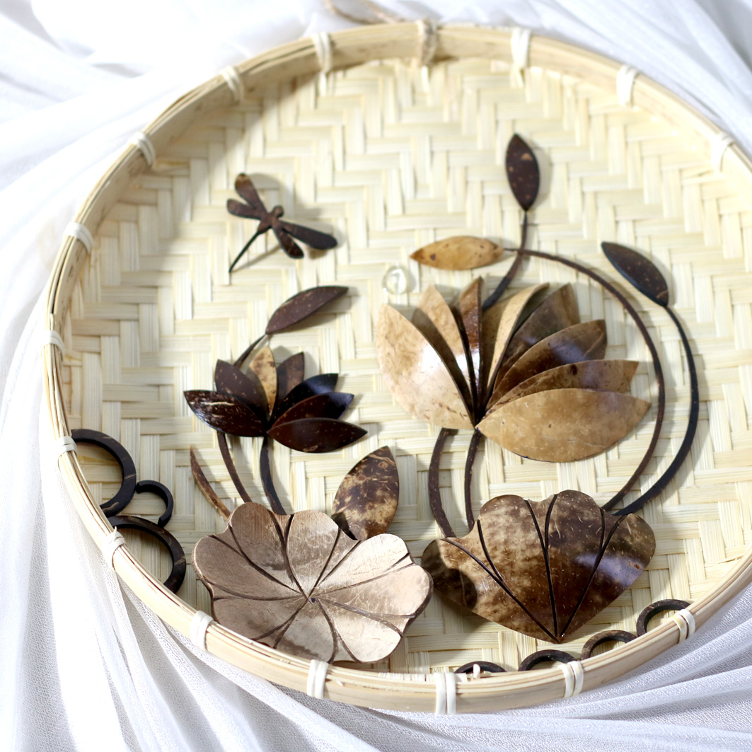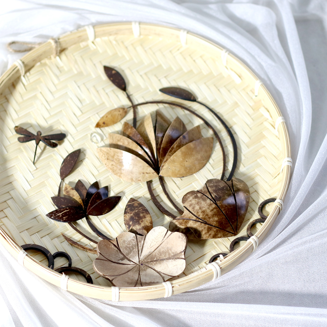 Sự độc đáo còn nằm ở khâu thiết kế hình hoa sen tinh xảo bằng gáo dừa kết hợp với chiếc nia tre mang đậm màu sắc dân tộc Việt Nam. Tranh gáo dừa ốp nia tre kết hợp hài hòa tạo nên một bức tranh giản dị, thẩm mỹ, nhẹ nhàng và tinh tế. Tranh có độ bền từ 3 -5 năm, đã xử lý ẩm mốc, tranh chất lượng và rất gẫn gũi môi trường.