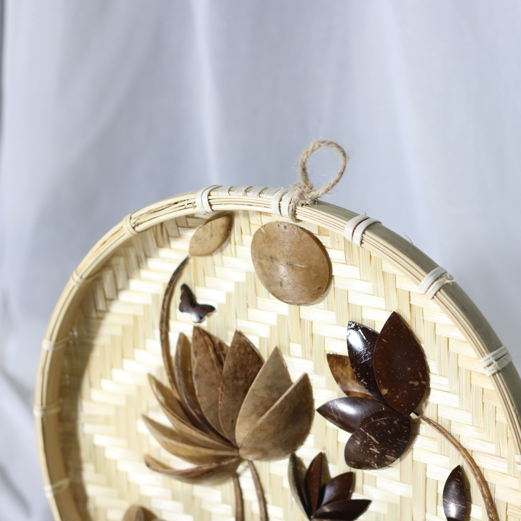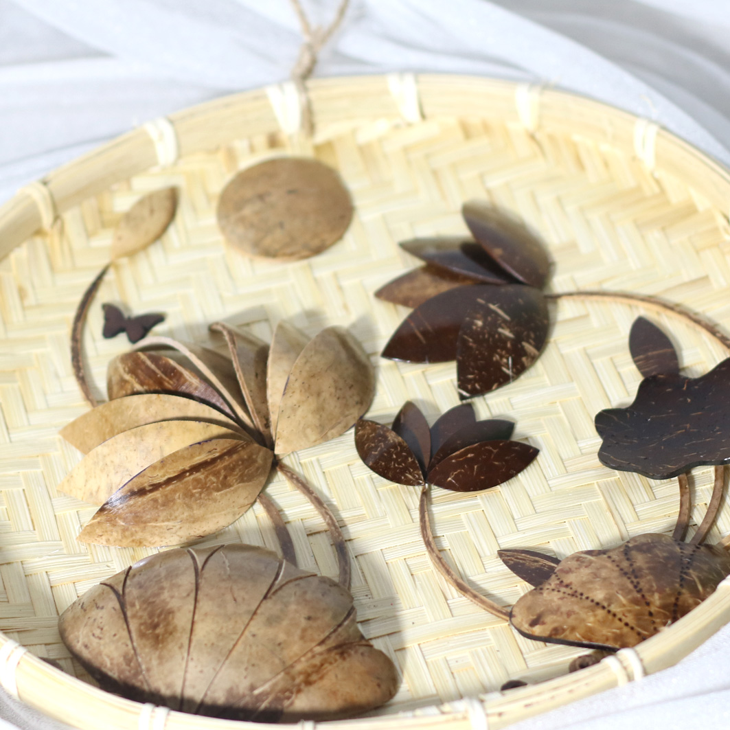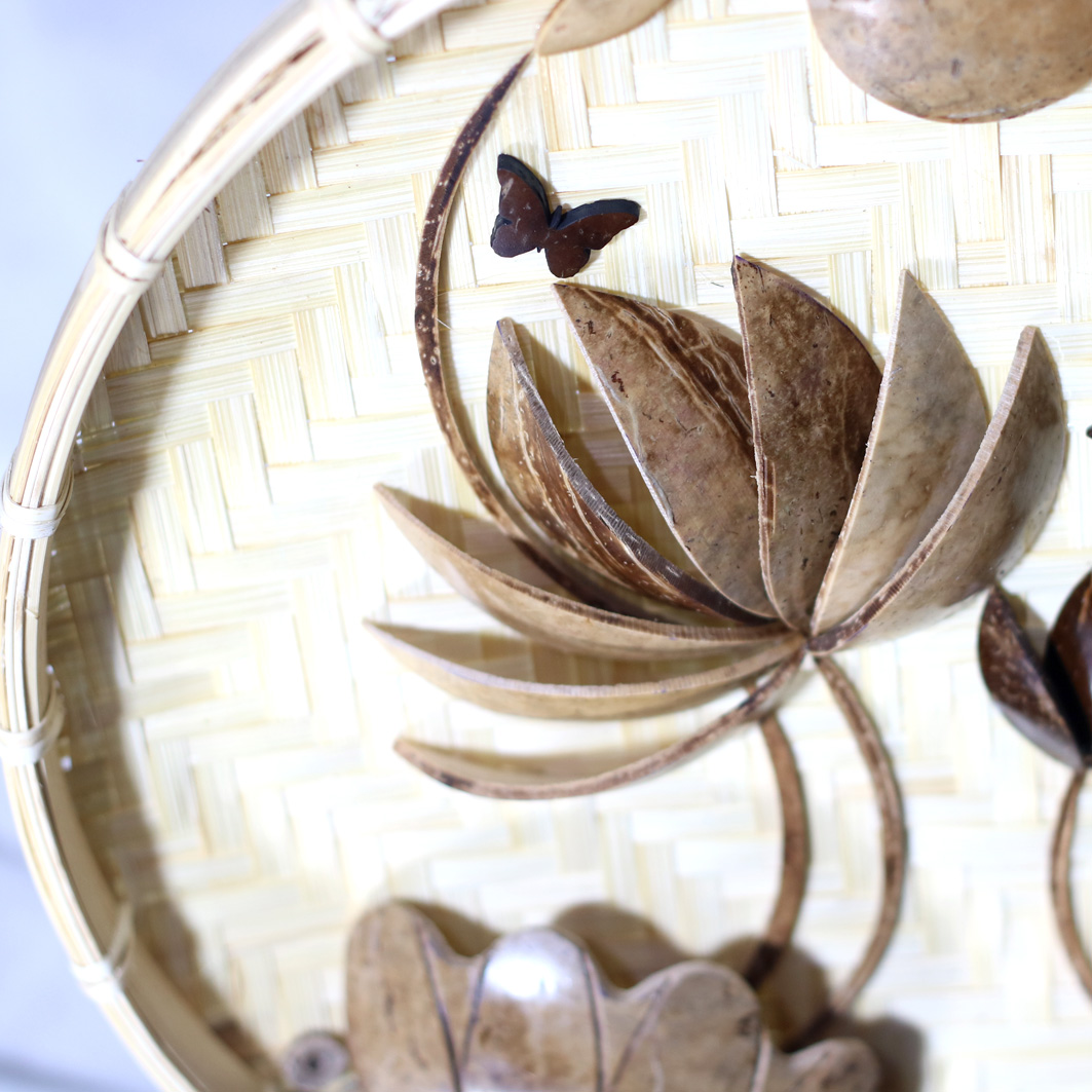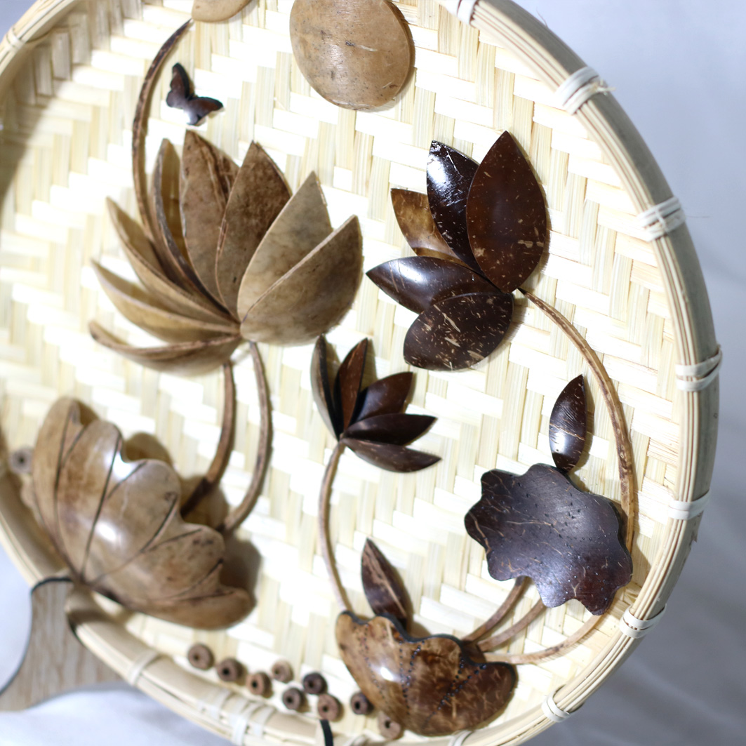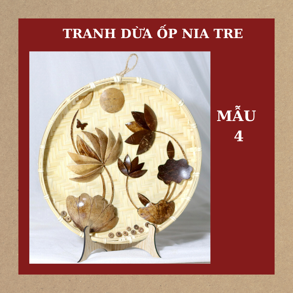 Sự độc đáo còn nằm ở khâu thiết kế hình hoa sen tinh xảo bằng gáo dừa kết hợp với chiếc nia tre mang đậm màu sắc dân tộc Việt Nam. Tranh gáo dừa ốp nia tre kết hợp hài hòa tạo nên một bức tranh giản dị, thẩm mỹ, nhẹ nhàng và tinh tế. Tranh có độ bền từ 3 -5 năm, đã xử lý ẩm mốc, tranh chất lượng và rất gẫn gũi môi trường.