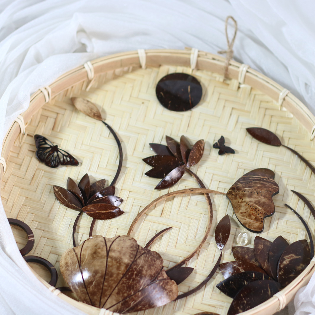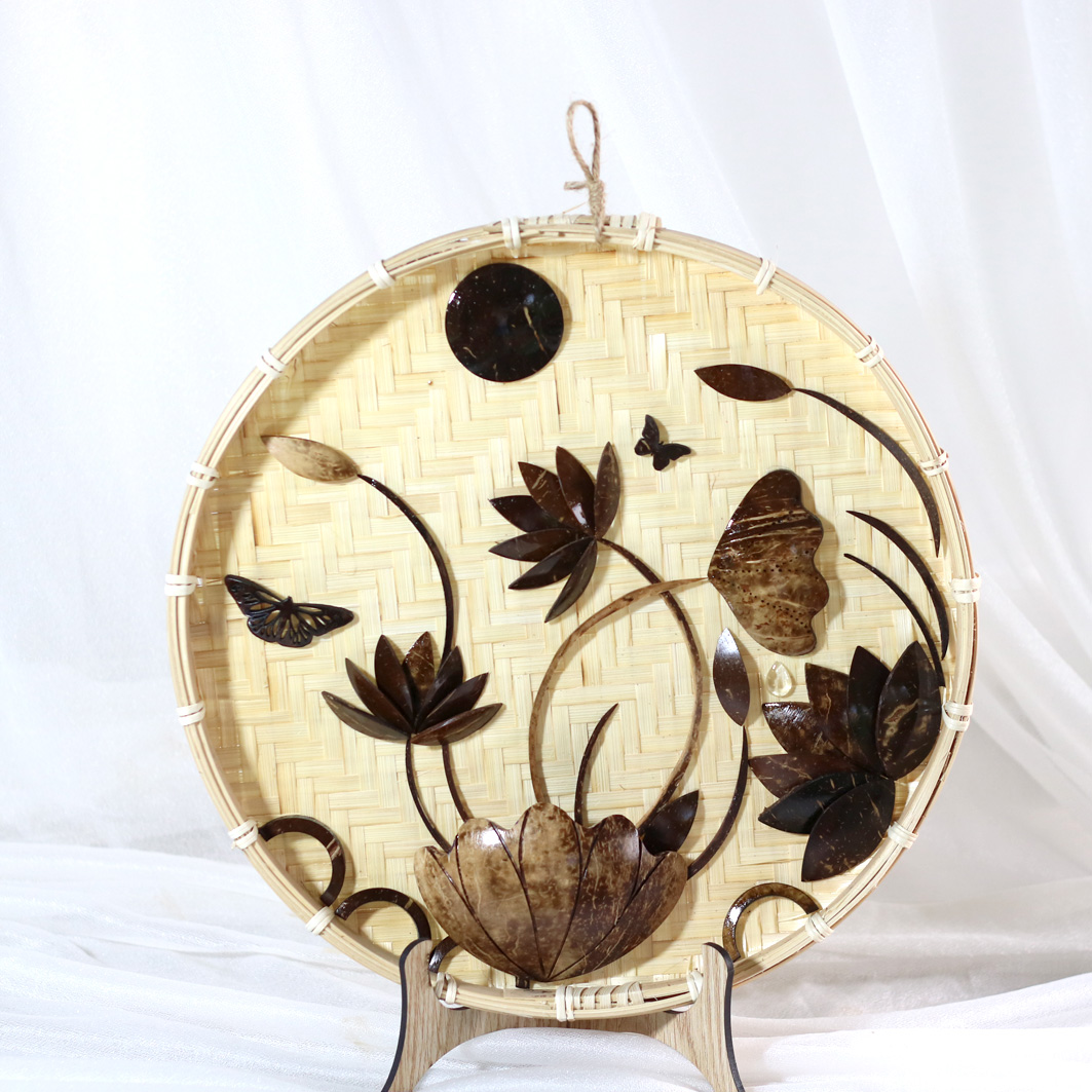 Sự độc đáo còn nằm ở khâu thiết kế hình hoa sen tinh xảo bằng gáo dừa kết hợp với chiếc nia tre mang đậm màu sắc dân tộc Việt Nam. Tranh gáo dừa ốp nia tre kết hợp hài hòa tạo nên một bức tranh giản dị, thẩm mỹ, nhẹ nhàng và tinh tế. Tranh có độ bền từ 3 -5 năm, đã xử lý ẩm mốc, tranh chất lượng và rất gẫn gũi môi trường.