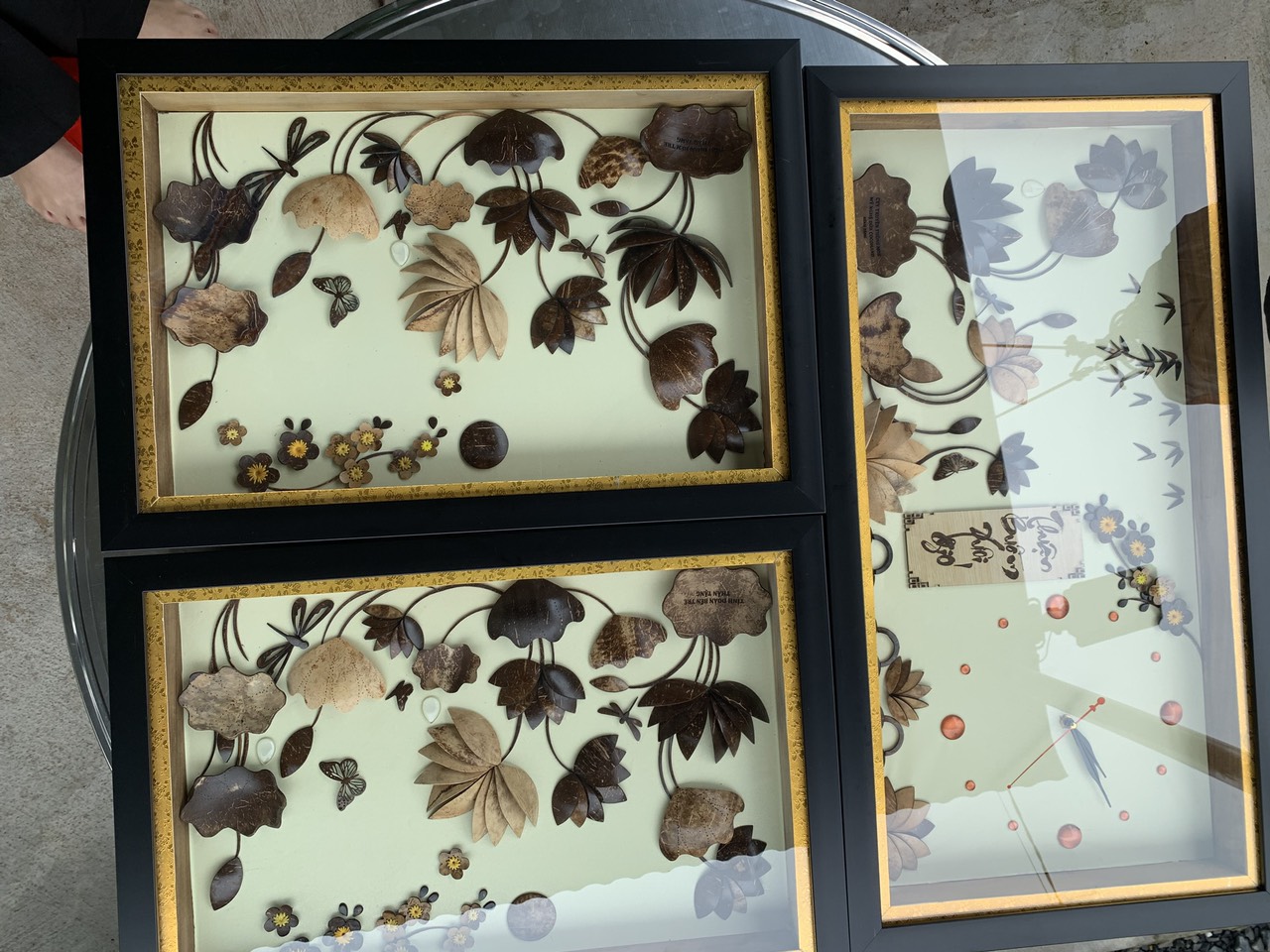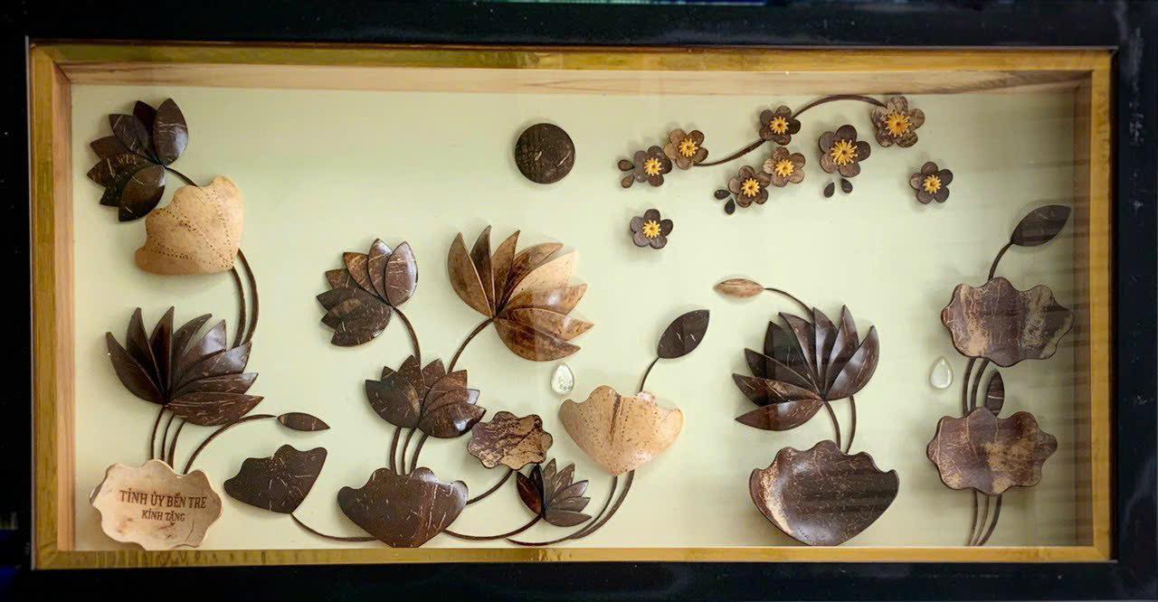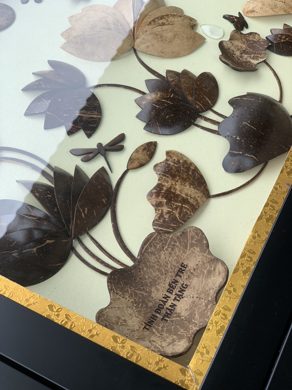 Nguyên liệu chính của Tranh Hộp Kiếng - Hoa Sen là gáo dừa nên rất gần gũi với thiên nhiên và có thể bảo vệ môi trường.
