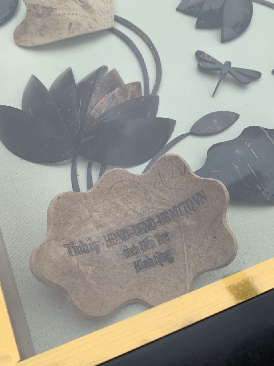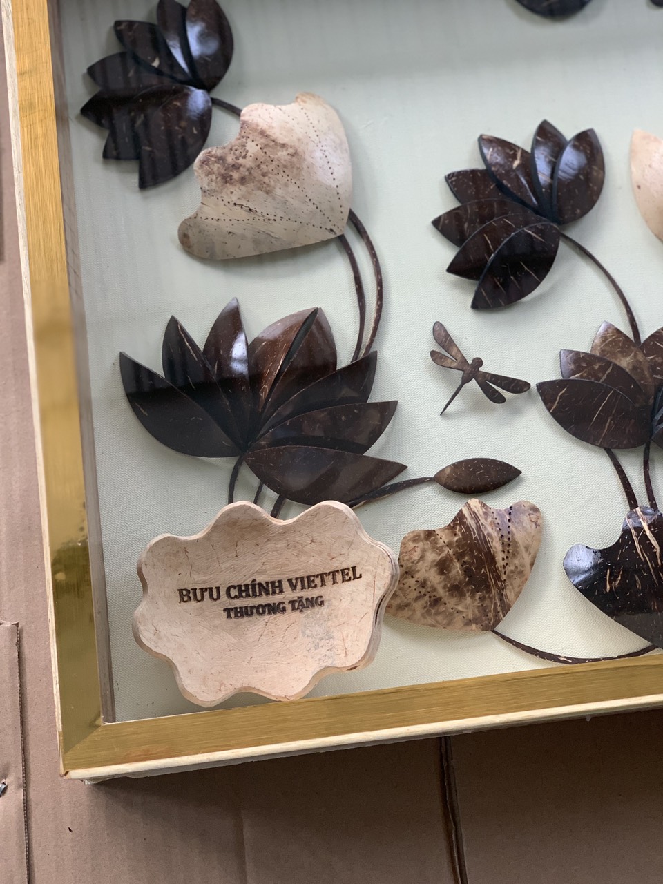 Nguyên liệu chính của Tranh Hộp Kiếng - Hoa Sen là gáo dừa nên rất gần gũi với thiên nhiên và có thể bảo vệ môi trường.