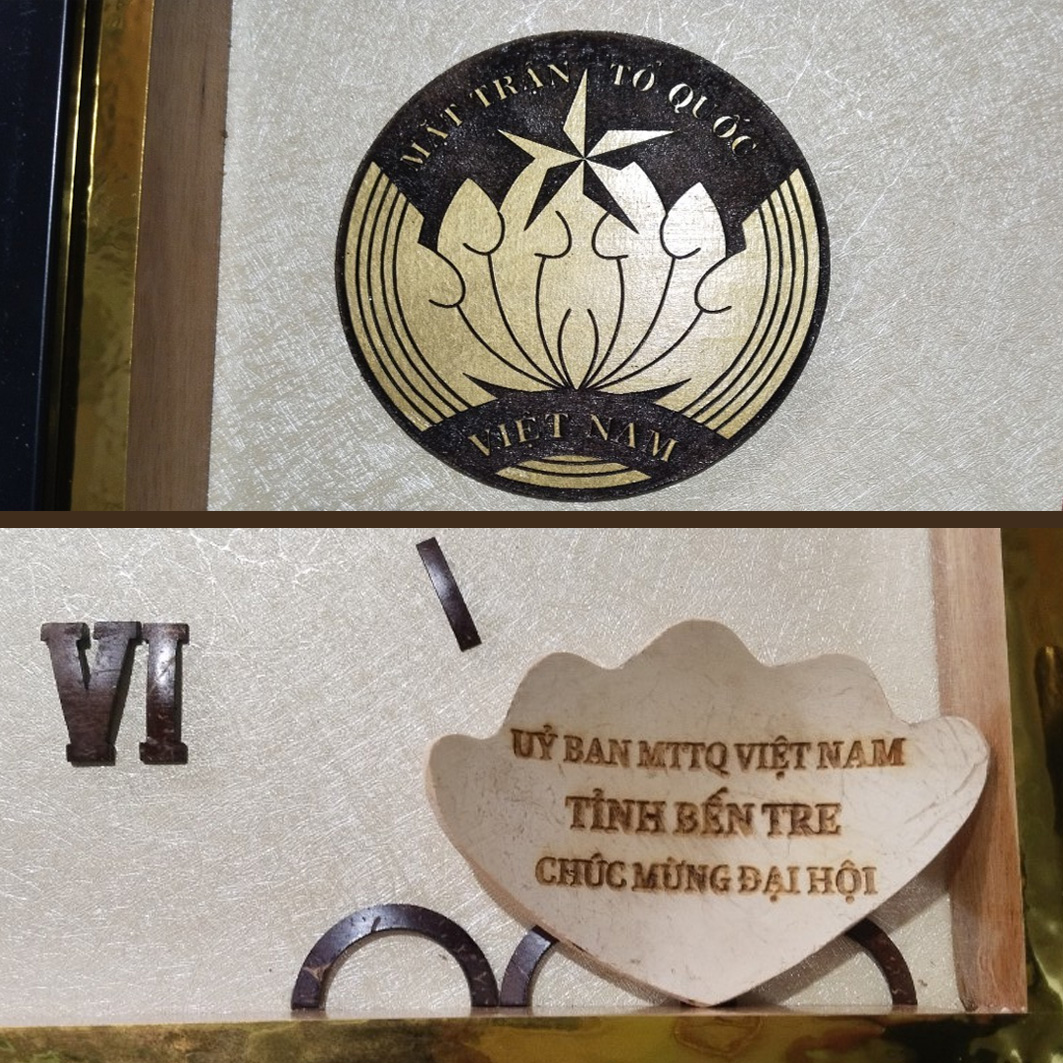 Quy trình sản xuất đảm bảo sự chính xác và tỉ mỉ trong từng chi tiết. Bắt đầu từ khâu lựa chọn gáo dừa phù hợp (không quá dày và cũng không quá mỏng), tiếp đến là bước làm sạch và phơi gáo, sau đó là công đoạn mài giũa, cắt gáo, khắc laser hình ảnh và chữ theo bản phác thảo của sản phẩm. Cuối cùng là công đoạn xếp ghép và dán từng chi tiết vào khung gỗ. Tất cả các công đoạn được thực hiện tỉ mỉ và cẩn thận để tạo ra một sản phẩm hoàn hảo.
